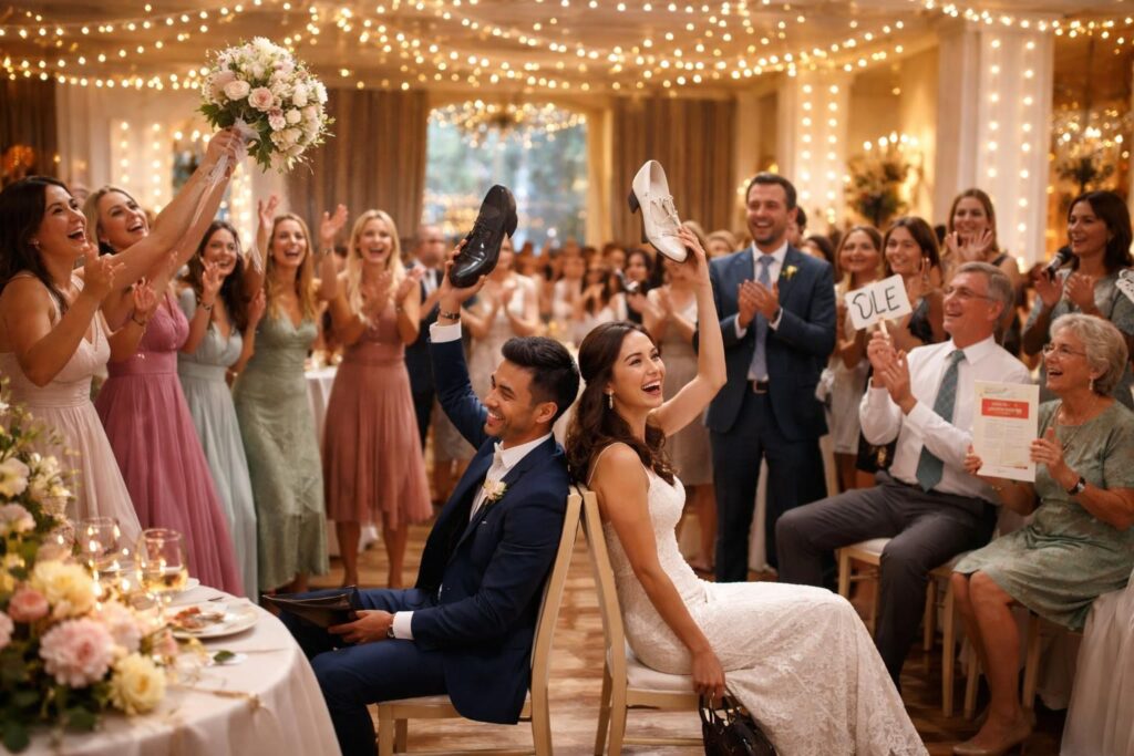 Le jeu « Lui et Elle » est devenu incontournable lors des célébrations de mariage. Cette animation engageante permet aux mariés de partager des anecdotes et des facettes de leur vie de couple tout en impliquant l’ensemble des invités. Ce jeu met en avant la complicité entre les mariés, générant de nombreux sourires et rires complices dans la salle. Les règles sont simples : les mariés s’assoient dos à dos, chacun tenant une chaussure de l’autre et la leur. Les questions sur leur relation sont posées, et ils doivent lever la chaussure correspondant à la réponse. La simplicité de la mise en place est compensée par la profondeur des interactions humaines qu’elle engendre.