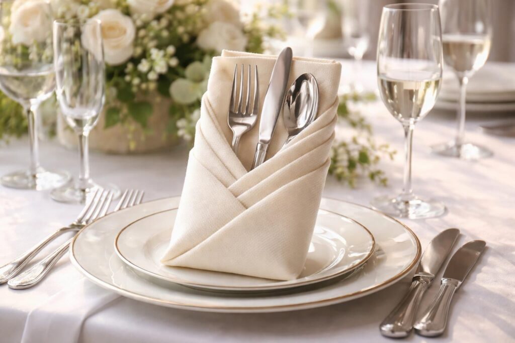 Pliage de serviette avec range-couverts pour un mariage : astuces pour un décor de table réussi